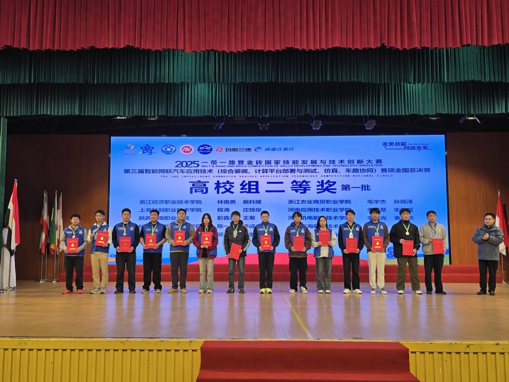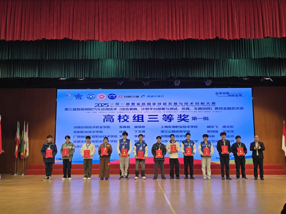 2025一带一路暨金砖国家技能发展与技术创新大赛第三届智能网联汽车应用技术赛项全国总决赛于2025年11月6日至9日在安徽汽车职业技术学院圆满落幕。上海东海职业技术学院机电学院师生组成的参赛队伍凭借扎实的专业功底、默契的团队协作和出色的临场发挥,奋勇拼搏,最终斩获高校学生组二等奖1项、三等奖1项,高校职工组三等奖1项的优异成绩,为学校赢得了荣誉。