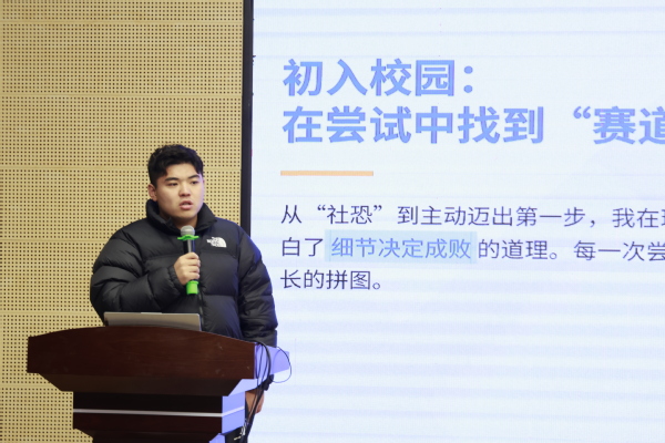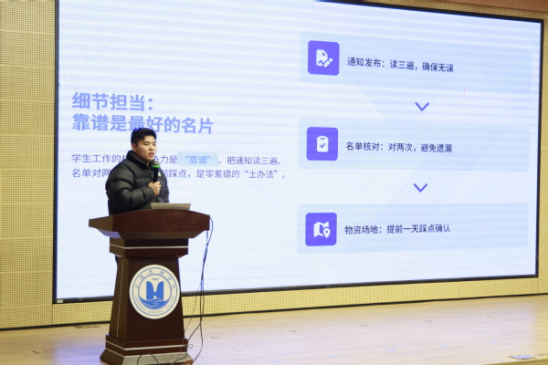 曾任学院学生会主席的宋金来同学,从学生会主席的责任与担当、如何平衡学业与学生工作、提升个人核心能力等几个方面进行分享。他提出时间管理策略,强调效率优先、劳逸结合;在能力锻炼方面,他认为大学生应掌握沟通艺术,积极参与实践创新活动提升能力。